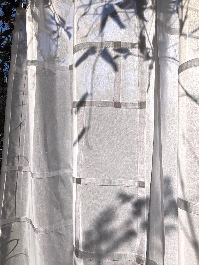This modernized Korean pojagi on organic cotton voile is a modern textile artwork blending a traditional Korean patchwork technique with a lightweight, semi-sheer, light filtering, organic fabric. The resulting composition is a single layer of fabric, often hung to diffuse natural light. Cotton voile is an elegant yet durable choice when both natural light and privacy are desired.
