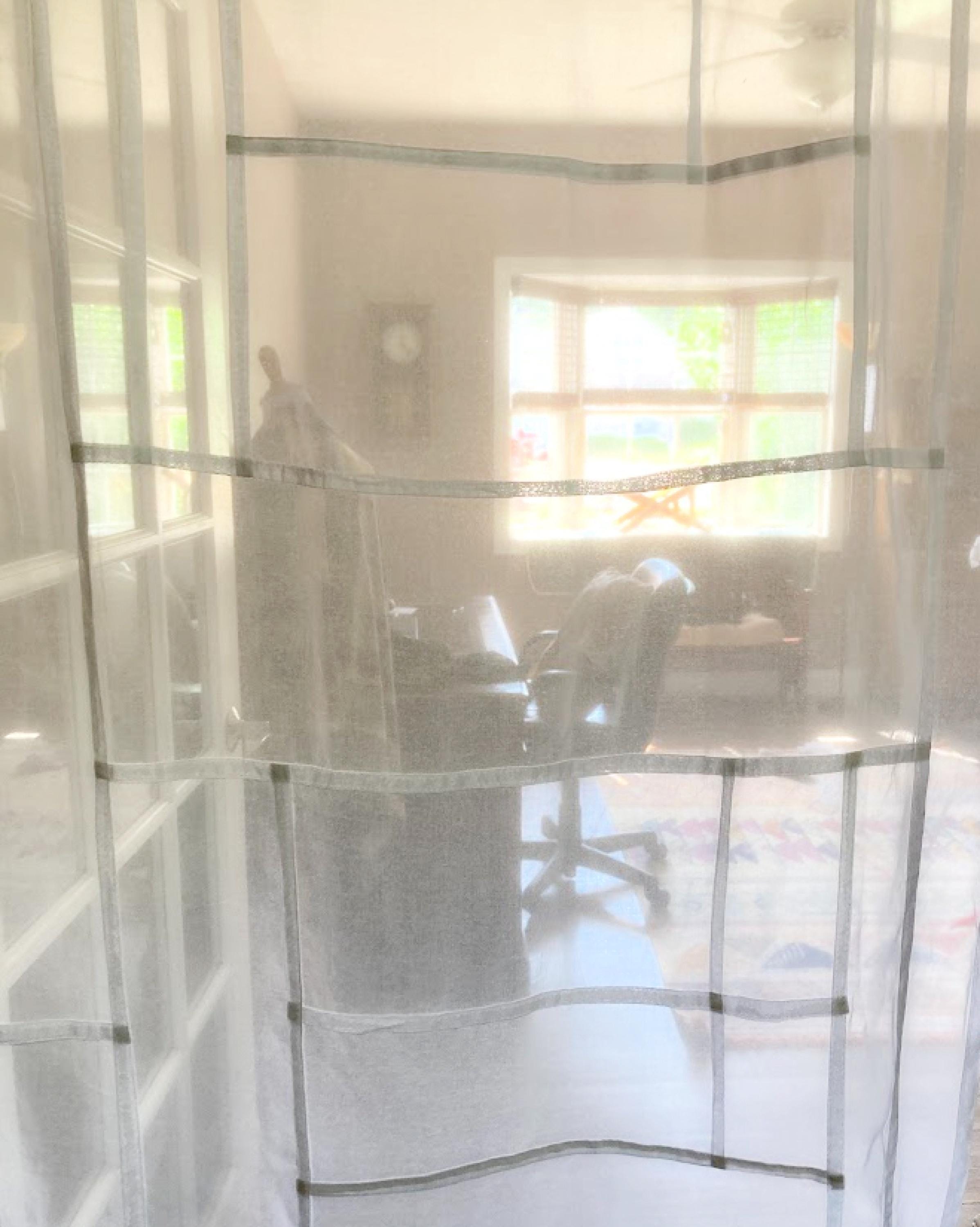 This modernized Korean pojagi on organic cotton voile is a modern textile artwork blending a traditional Korean patchwork technique with a lightweight, semi-sheer, light filtering, organic fabric. The resulting composition is a single layer of fabric, often hung to diffuse natural light. Cotton voile is an elegant yet durable choice when both natural light and privacy are desired.