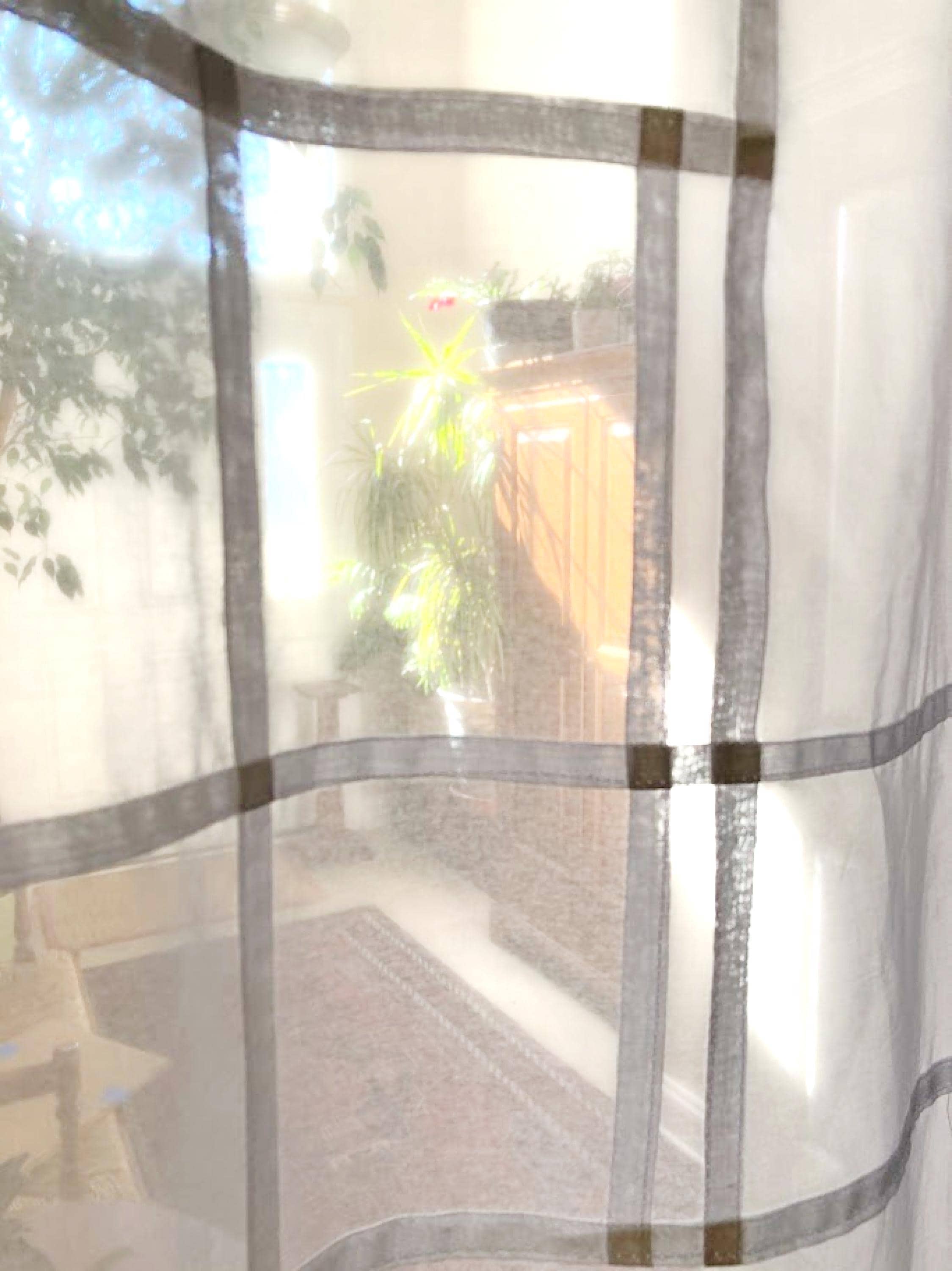 This modernized Korean pojagi on organic cotton voile is a modern textile artwork blending a traditional Korean patchwork technique with a lightweight, semi-sheer, light filtering, organic fabric. The resulting composition is a single layer of fabric, often hung to diffuse natural light. Cotton voile is an elegant yet durable choice when both natural light and privacy are desired.