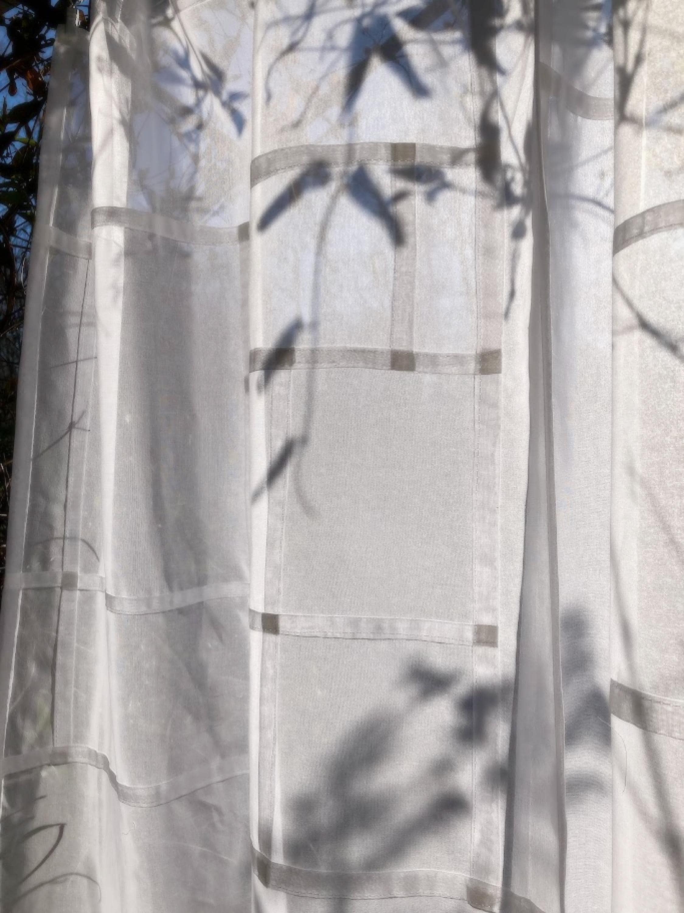 This modernized Korean pojagi on organic cotton voile is a modern textile artwork blending a traditional Korean patchwork technique with a lightweight, semi-sheer, light filtering, organic fabric. The resulting composition is a single layer of fabric, often hung to diffuse natural light. Cotton voile is an elegant yet durable choice when both natural light and privacy are desired.