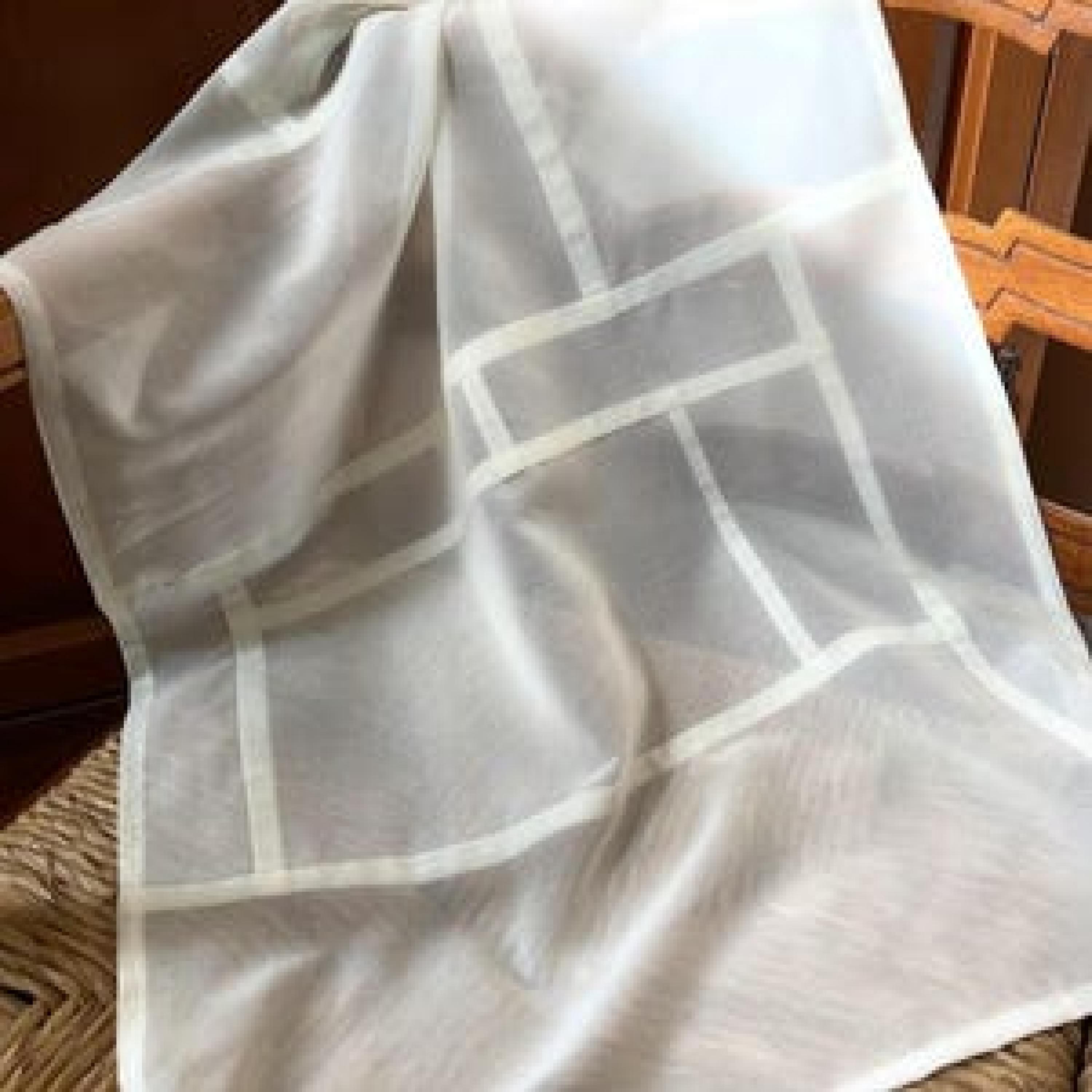 This modernized Korean pojagi on organic cotton voile is a modern textile artwork blending a traditional Korean patchwork technique with a lightweight, semi-sheer, light filtering, organic fabric. The resulting composition is a single layer of fabric, often hung to diffuse natural light. Cotton voile is an elegant yet durable choice when both natural light and privacy are desired.