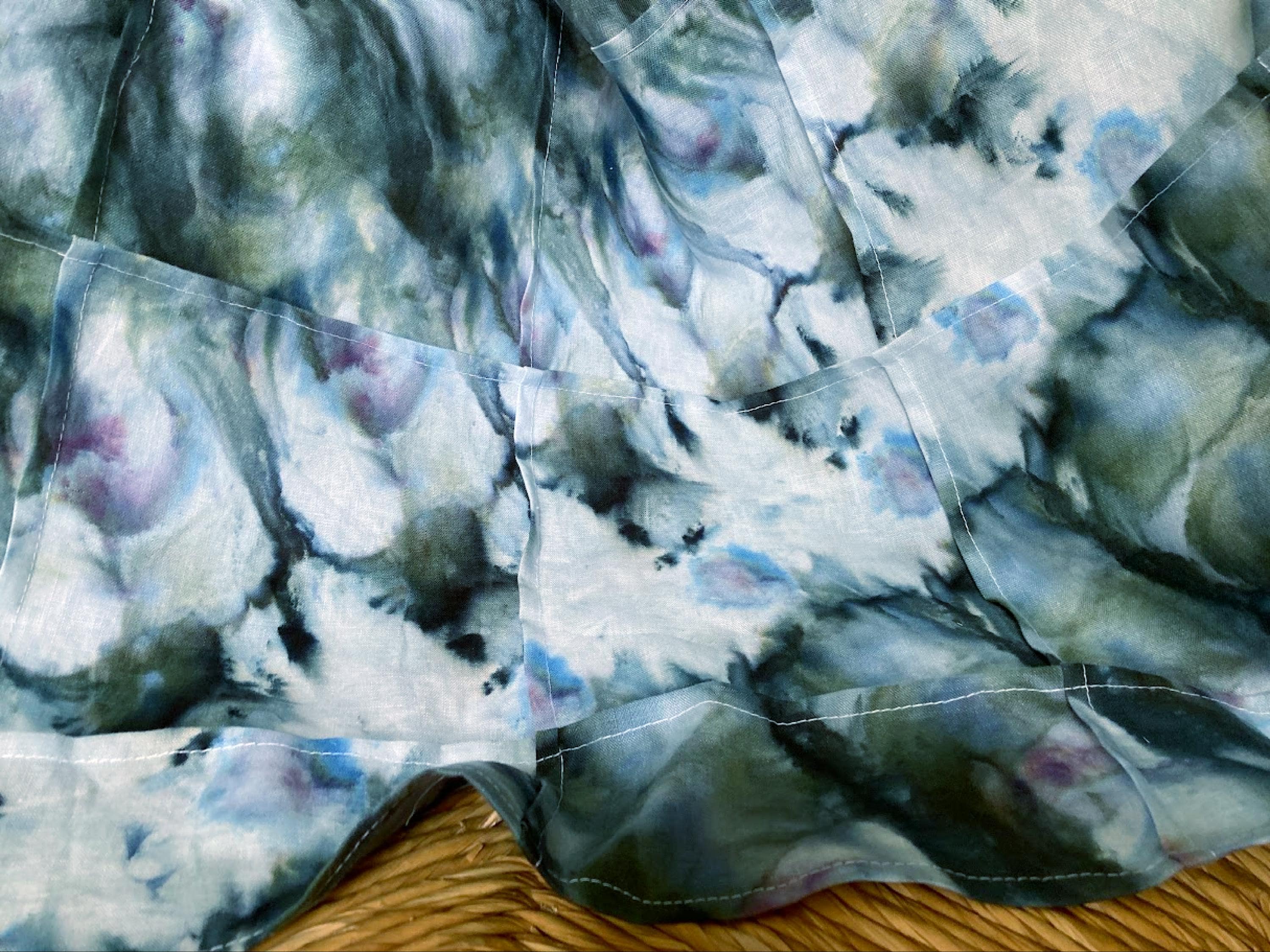 This listing is an original composition, designed and hand-dyed on 100% organic linen in frothy sea green, teal, and dollops of violet flower tops throughout. Enchanting organic design top-stitched in a glass block pattern.